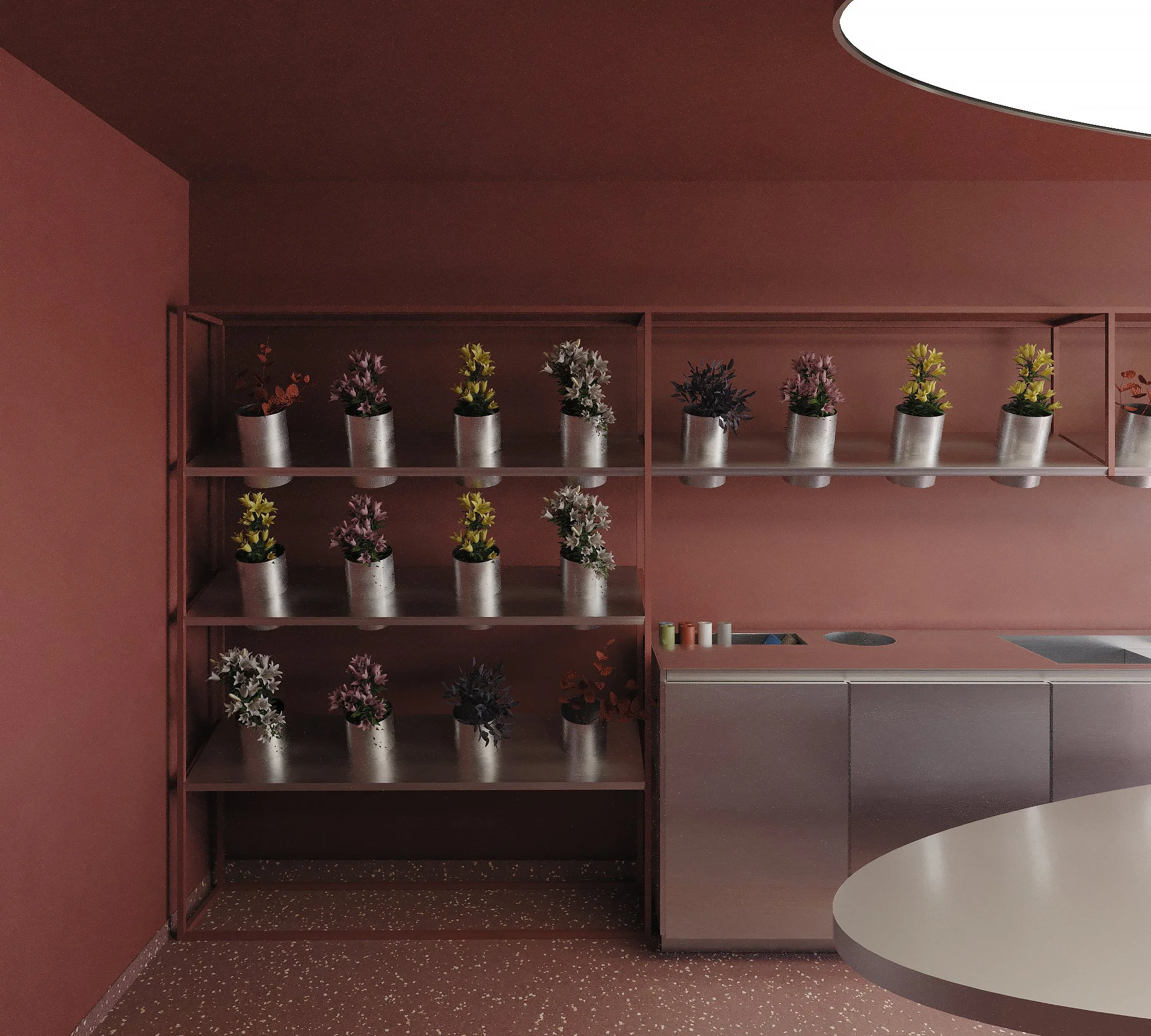 At the core of the design lies the oven — not only as a functional centerpiece but as the symbolic heart of the space. Rather than hiding it, the oven is proudly exposed and placed at the center like a glowing installation, anchoring both the workflow and the visual identity of the interior. Around this nucleus, the architectural concept takes shape as a careful balance of contrasting materials: the warmth and tactility of terracotta meet the clean precision of stainless steel, while rough natural stone is set against the smooth clarity of glass.